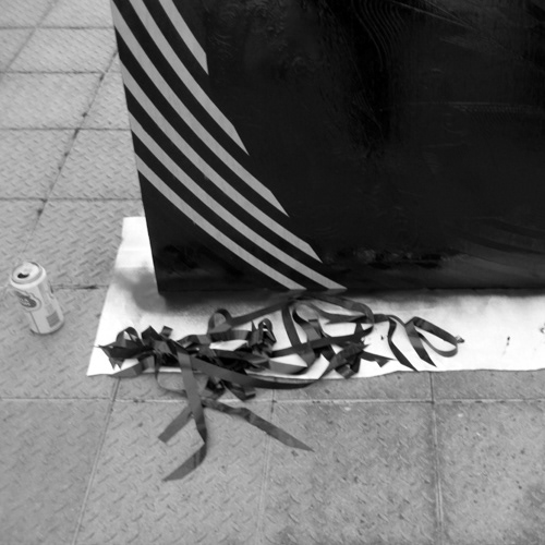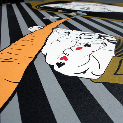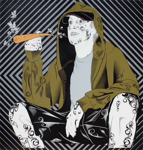 3 versions of the work, Smoke carrots, not ciggies. Top: Adam smokes Paris, 2012 8 colour stencil on 15mm ply 1220mm x 1220mm Middle: Adam smokes Sydney, 2009 6 colour stencil on 10mm ply 2350mm x 1600mm Bottom: Adam smokes London, 2010 6 colour stencil on 10mm ply 2000mm x 2000mm
